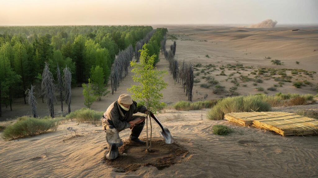 The wind comes first. A low hiss sliding across the Gobi’s cracked skin, lifting grains of sand that sting the eyes and slip under shirt collars. On the horizon in northern China, a strange green line now cuts through the beige — row after row of poplars and pines, their trunks wrapped in plastic, their roots forced into a soil that never really asked for them. A soldier in a faded cap leans on his shovel and squints at the sky, watching a dust cloud that never quite forms. “Better than before,” he mutters. “We could not breathe back then.”