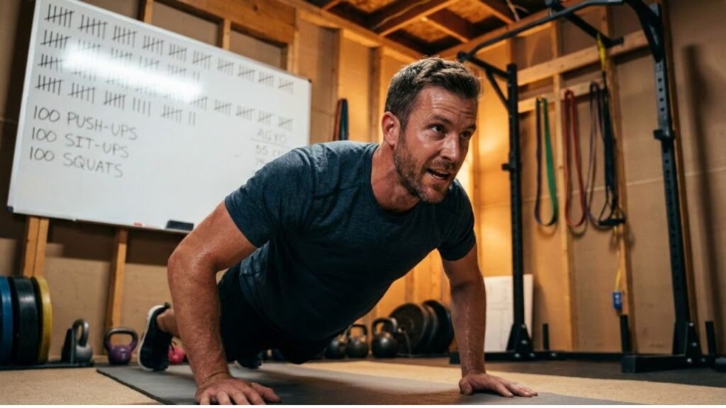 I count distance-based exercises as part of my total reps. Running or rucking 100 meters equals one rep. Heavy carries over 10 meters also count as one rep. A 10k run gives me 100 reps. On some days I complete that run and then finish the remaining 200 reps with push-ups or pull-ups or squats or kettlebell swings. Most Sundays I complete 100 reps of bench press using German Volume Training and follow it with a 20k run. Sometimes I go for longer distances and cover 30 kilometers which completes all 300 reps in a single session.