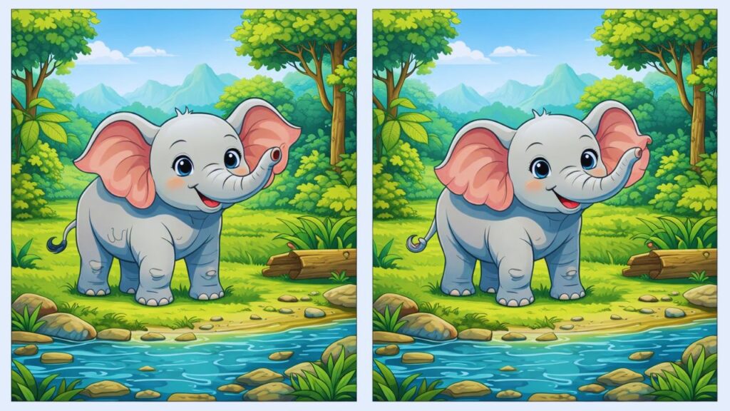 Here is the solution. The two elephant images contain three small differences. If you did not find all of them do not worry because tiny details can be very difficult to spot. The first difference involves a flower on the tree stump. The left image shows a small flower sitting on the stump but the right image does not have this flower. The second difference is a butterfly. In the left image a butterfly rests on a leaf close to the elephant. The right image has no butterfly in that spot. The third difference appears on the elephant’s right foot. The left image shows a small mark or detail on the foot that is missing in the right image. These differences may seem small when viewed separately but finding them all requires good observation skills. You need patience and a careful eye to notice such subtle changes.