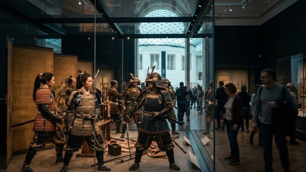 The Samurai exhibition is the first to examine how the warrior class had its image & myth created over time. It aims to challenge what people think they know about these Japanese figures. The exhibition brings together more than 280 objects and digital media from the museum’s collection & 29 other lenders from around the world. Many items are being shown for the first time including a suit of samurai armour. The display features weapons & armour alongside paintings and woodblock prints as well as books and clothing plus ceramics and photographs. The samurai appeared in the early medieval period from the 1100s to 1600s when wealthy households hired warriors for private security.